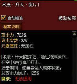 术法升天: 和以前比改动比较大的一个技能系列(因为包括了升天旋和升天堕这两个技能)满等级的伤害应该在5000%左右 全等级10S CD 自身是霸体技能 同时破霸体 蛮好用的一个技能就是打博格图里那些霸体兵不造为啥好像是动作有点墨迹的原因容易被打