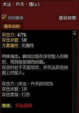 另外一个觉醒 势 是增加升天堕的攻击范围 但是 现在的升天堕远远不如以前的好用 改版后已废了大半 虽然说 技能释放是无敌 但是只有对那些能浮空的怪物才有效 如果不满足这些 使用后就和鬼影爪距离过远一样 只有那一闪的动作 而且 砸地的时候 只有被抓住的那个怪才会收到伤害。这样条件苛刻的无敌简直是鸡肋中的耻辱#(null)