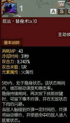 嘛 就是原来的替身术和隐身的2合一 按一下隐身5S 再按一下会出现类似于急遁这样的动作并在原地扔个延时爆炸木头 炸了后会眩晕敌人 出血在10层以上时会额外加3s 眩晕