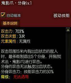 觉醒2是分身 攻击范围内一个出血怪一个分身最多5个分身 每个分身攻击力为原先的30% 配合手里剑的穿刺清小怪还是很舒服的