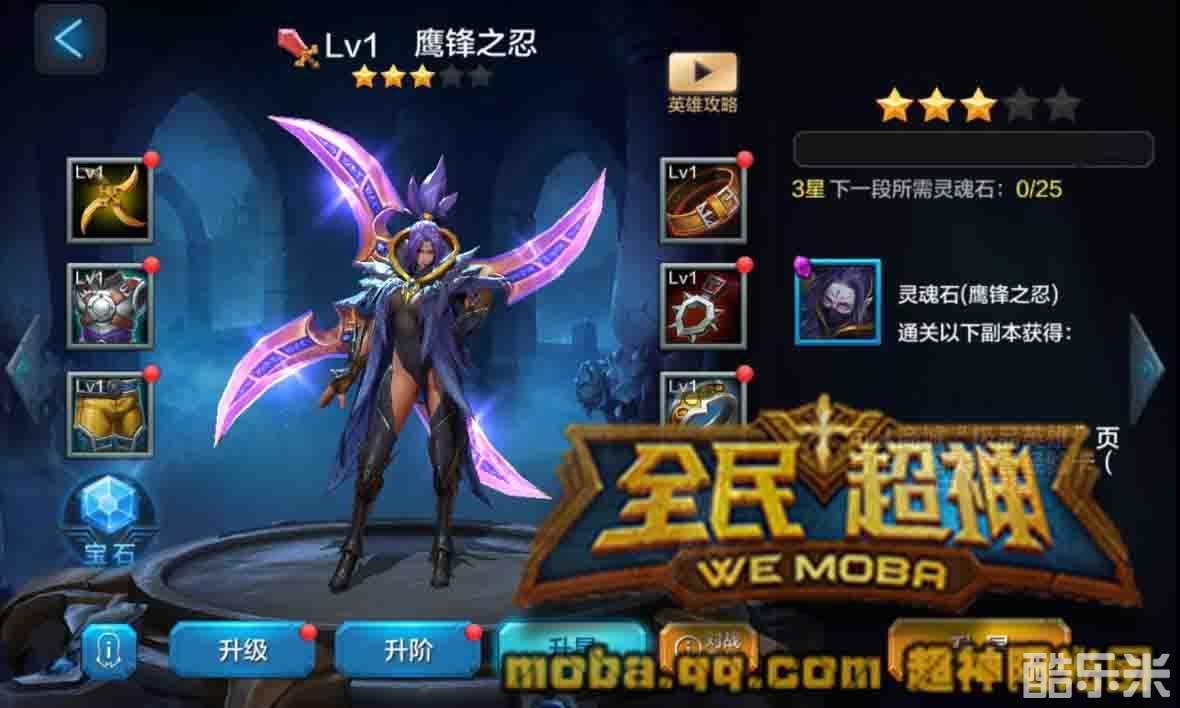 鹰锋之忍所需要升阶装备使用的材料主要来自闯关掉落,与升级顺序一样,同样装备阶级越高属性越强,英雄战斗力也越高。