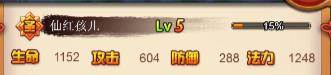 这是仙红孩儿的基础数据,没有装备,等级5的情况下。生命1152,攻击904,法力1248。攻击还是蛮高的,防御略低。生命值有一点点的少。