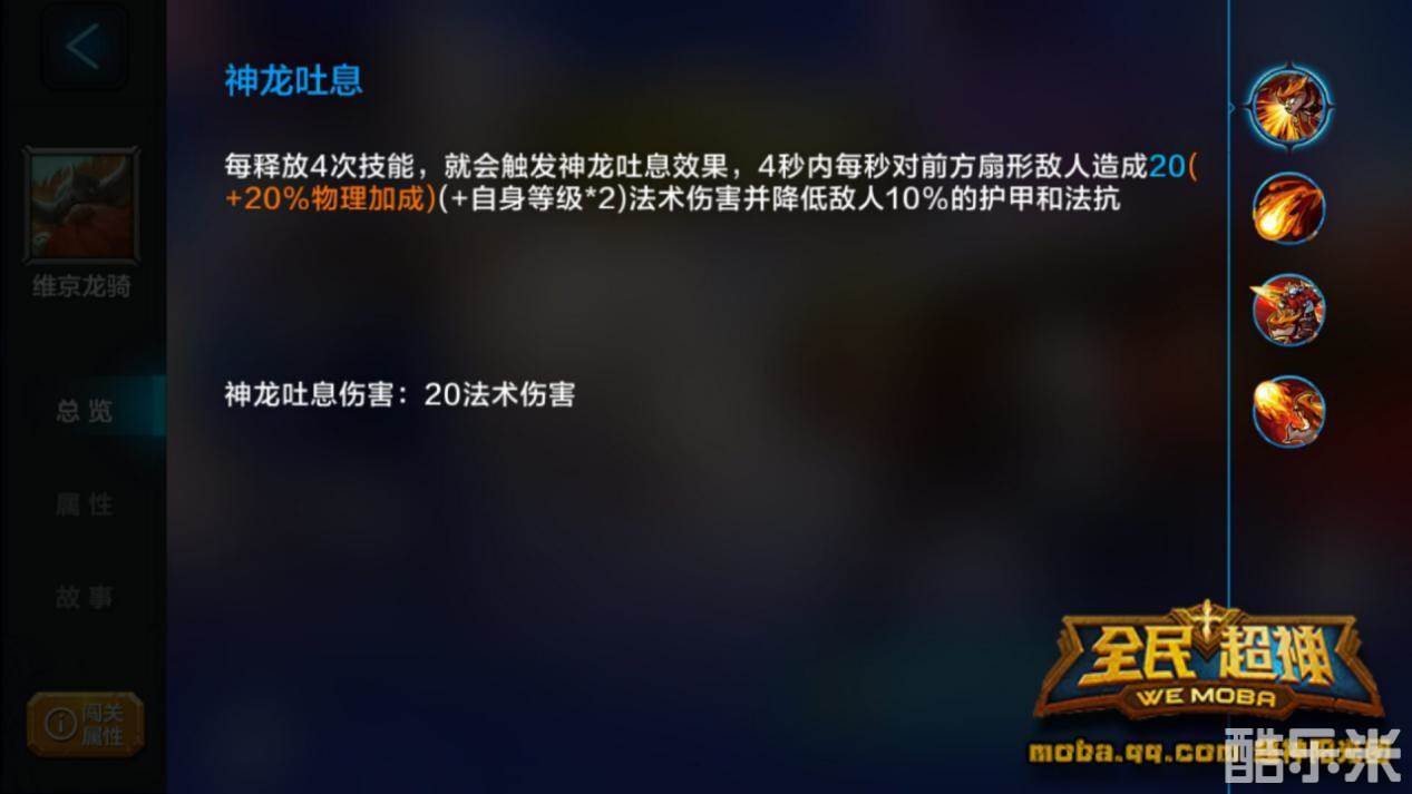 神龙吐息(被动) :每释放4次技能,就会触发神龙吐息效果,持续一定时间,造成前方扇形火焰伤害