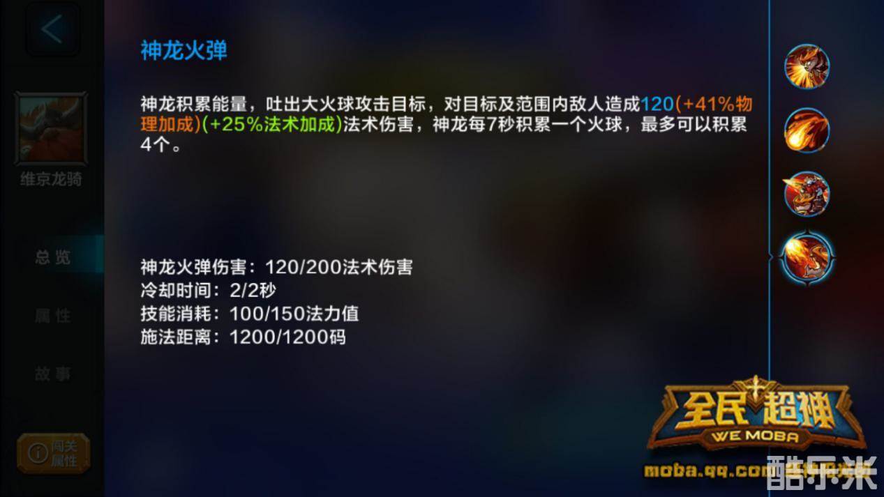 神龙火弹:神龙积累能量,吐出大火球攻击远方目标,并造成小范围伤害。神龙每隔一段时间积累1个火球,最多可以积累4个。