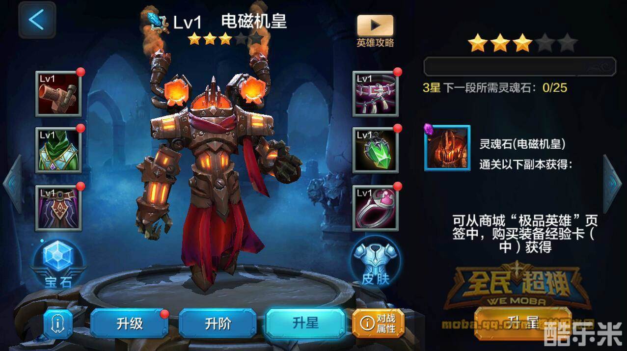 最后一个就是英雄的星等,电磁机皇初始为3星,想要升星则需要不同数量的灵魂石。现阶段由于电磁机皇的灵魂石只能通过商城购买,或者靠人品爆发通过抽奖获得,所以想要升到5星还是拥有一定的难度的,小伙伴们可要加把油啊。