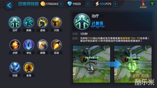 召唤师技能选择上,阿拉丁作为肉盾英雄,个人推荐选择治疗或者闪现。
