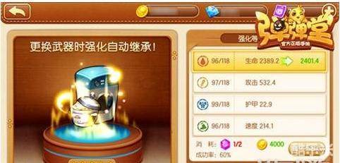 玩家通过《弹弹堂手游》竞技模式、每日活跃任务、弹弹宝藏等,都可以获得大量的武器强化石。使用武器强化石可以强化武器“生命”“攻击”“护甲”“速度”四大属性,从而让你的武器攻击力更强,防护力度更高,出手速度更快,持有者的血量上限越高…提升整体的战斗力。