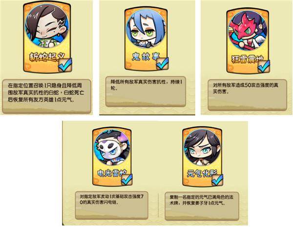 其中刘邦和惧留孙的两张法术牌均可以降低所有敌人30的真实伤害抗性,姜子牙的元气化形可以复制雷震子或云中子的法术,基本思路就是先用刘邦和惧留孙的法术降低敌人的抗性,然后用剩下的法术清场。