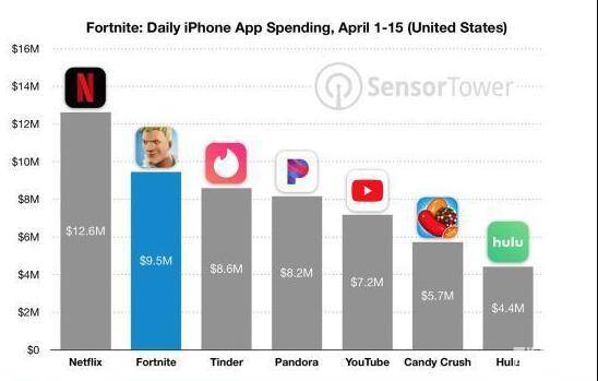 从测试阶段开始《堡垒之夜》就势头迅猛,在登陆iOS平台30天之后总收入超过了2500万美元。根据Sensor Tower提供的数据,4月头两个星期,美国地区iPhone用户在《堡垒之夜》上总共花费了950万美元,仅次于Netflix(1260万美元)。