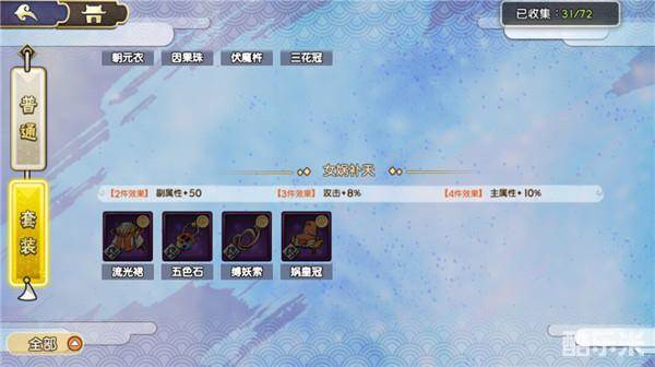 套装属性加的攻击不低,而且最重要的是有命中加成,游戏里的命中除了影响攻击的命中率以外,同时也影响特殊效果的触发概率,比较适合像妲己这类带有控制效果的仙人使用。