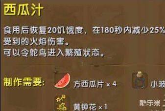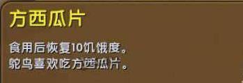驯服:如果要驯服鸵鸟的话,喂鸵鸟吃的食物是【方西瓜片】,方西瓜皮可以通过打破陶罐获得;