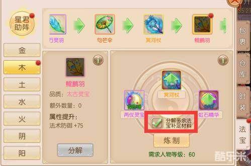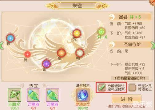 以前必须要足够的法宝才能进行法宝合成和星君进阶,现在可以自动分解多余低阶法宝补足材料,然后进行合成/进阶,是不是炒鸡方便呢~