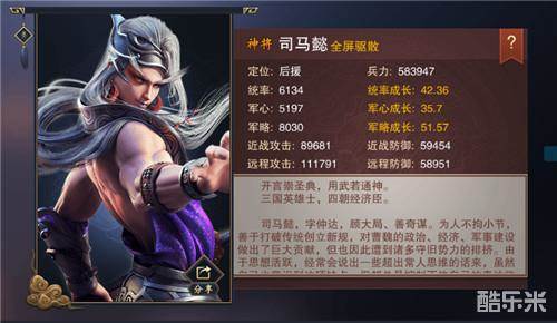 作为诸葛亮后期最大的对手,司马懿在《血染征袍》中也有着神将的定位。相比于《血染征袍》的其他武将,单从伤害上来看,司马懿并不是特别突出的,但是他的必杀尤为恐怖,混元阵发动的时候,能够对全屏目标造成152%的远程伤害,瞬间爆发极高,最重要的,他还能驱散敌方增益和移除召唤单位,也就是说,司马懿几乎克制游戏中所有的武将。