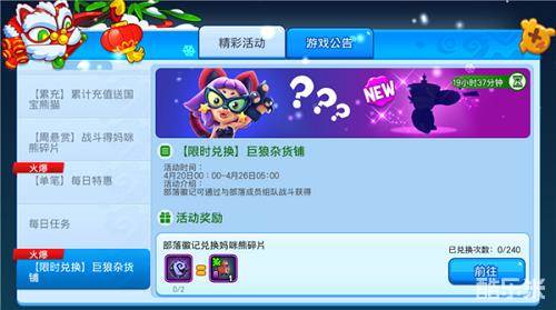 4月20日-4月26日,巨狼杂货铺再次更新店铺商品,即刻起使用部落徽记能够在活动期间现实兑换宠物妈咪熊与吃瓜群众碎片,技能龙卷风、勾斧与英勇一跃碎片,同时也可选择兑换消耗物品烤鸡和迷幻菇。