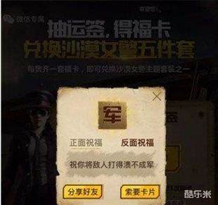 获得抽签资格后就能抽取福卡,或是通过向好友索取福卡,集齐一套8张福卡,就能兑换沙漠女警主题套装之一!