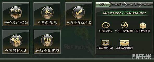 杀怪经验+20%八点半自动报名骰子上限提升神秘专属商城