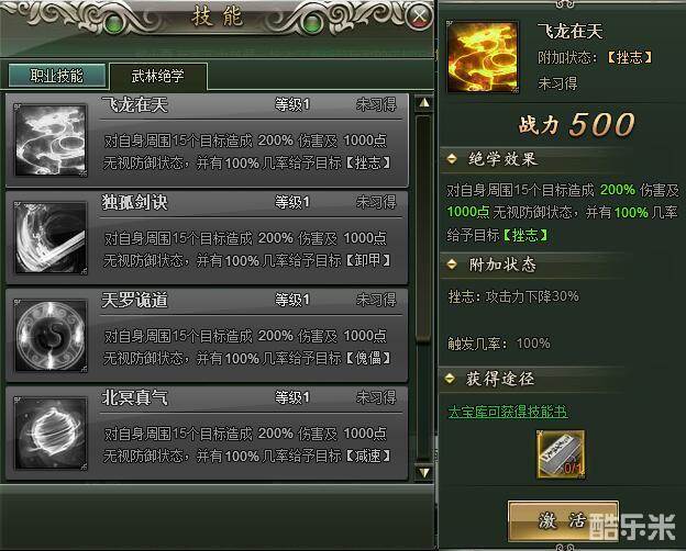 在游戏中现如今唯一获得武林绝学的地方就在大宝库,通过消耗探宝券可以抽取武林绝学,使武林绝学提升至宗师级,宗师级的变化是让武林绝学技能变为被动,每次攻击时均有几率触发该技能。