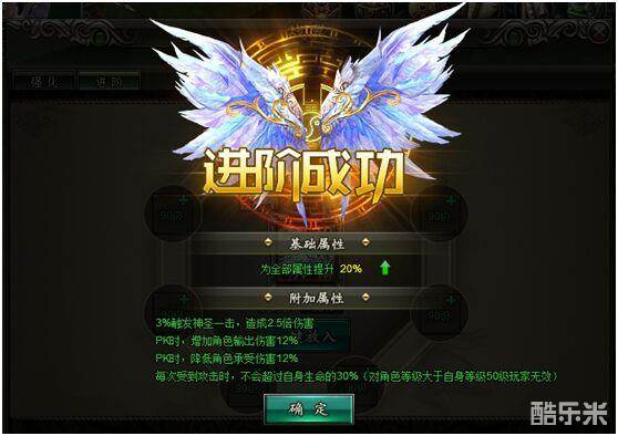 还没有完,在小于玩家自身等级50级之内,每次受到攻击时不会超过自身30%的生命。不得不说的是战翼幸运值,战翼幸运值是表现为每当玩家进阶失败时,随机增加幸运值,该幸运值无限累加,当玩家战翼进阶成功时清空,幸运值越高,进阶成功率越高。要注意的是退阶失败是不会清空幸运值的,只有成功才会清空幸运值。