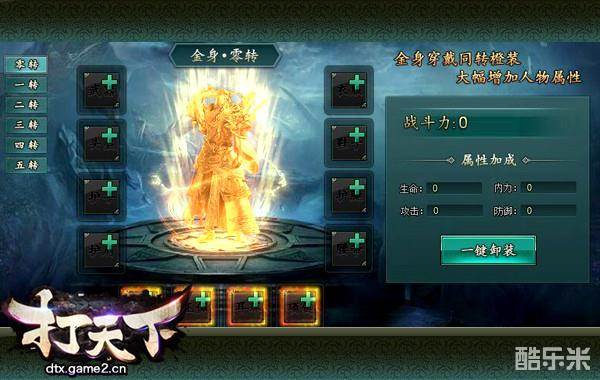 每转的金身各自独立,与人物角色一样,也是分别可以穿戴不同部位的12件装备,一件装备只可使用一次,穿戴在金身或人物身上。每件装备都将给人物带来基础属性的增加,并且这些装备也是可以强化,强化越高,增加的属性越高。