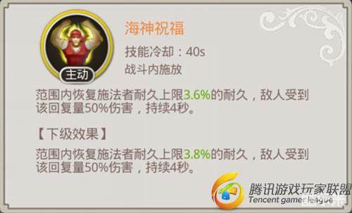 4、海神祝福(主动技能):范围内恢复施法者耐久上限的百分比耐久,敌人受到该回复量50%的伤害,持续四秒。