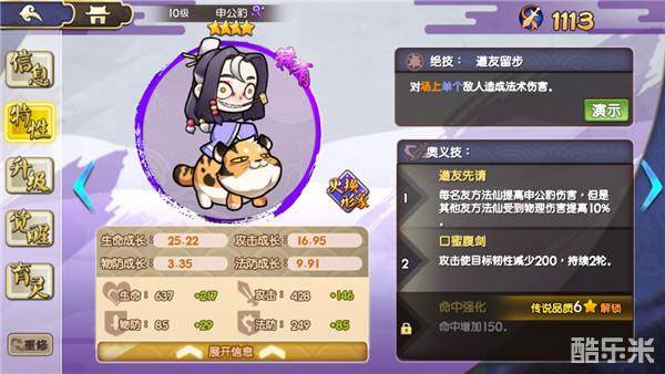 其中核心点是申公豹,属于不可替换。每有一个仙法申公豹提高10%的伤害,就是说四仙法中你看到的申公豹输出比他实际战力伤害高。法术选择“呼朋唤友”、“认真一点”都行,“呼朋唤友”召唤一个自爆的道友,道友位隐身单位,能卡位,用来打伤害,或者作为妲己“倾国”的附加目标,推荐道友做伤害使用的时候放在对面T的后面,优先配合杀T,配合“倾国”的时候放在主输出周边。“认真一点”申公豹提高10%攻击,清除两名元气已满的敌方仙人元气,一般有一名敌方关键仙人满元气就能使用,不用追求极致,注意敌方仙人元气未满不能消除,有超过两个目标会随机选择。符石方面带一个“净元”,作为主输出保证控制的时候有一定解控能力,三个“聚力”提高前三回合的输出能力,保证快,有专属符石可以直接使用专属符石。