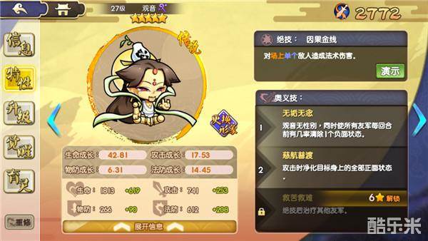 观音,攻击能净化各种buff,因为在中排的原因可以保证后续输出可以不被对面的buff影响,每回合开始前几率净化自方仙人的一个debuff,保证输出位不被控制或者净化T的禁疗效果。法术推荐“往生咒”配合其他法术打控制。装备方面推荐月套增加爆发。符石推荐两个“聚力”增加前期伤害,两个“瞬破”,观音普通攻击伤害很低,大招伤害还是挺可观的。