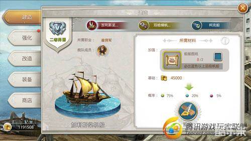 “建造”顾名思义就是在此建造船舶,在这里我们要是有船舶图纸,即可制作各种各样的船舶。不同的船舶所需职业也是不同,在这里我们能够看到船舶图纸所需材料,所需金币以及制作成功的概率。