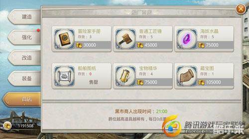 “商店”指的是船厂商店,里面卖的都是冒险家手册、普通工匠锤、海妖水晶、船舶图纸、宝物精华、藏宝图等。爵位越高道具越稀有,每日0点重置,小伙伴们若是需要一些材料,可在这里进行购买哦!