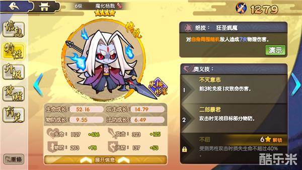 这阵容里魔化杨戬的站位是前排最下,如何保证他的安全是关键。因此在符石的选择上首推神隐,只要隐身触发的话就能把后续伤害转移到中间位的刑天上(因此刑天带的是斗战魔神)。另外魔杨每次最多只扣40%的血,自身攻击还能吸血,前三回合还能免死,加上还有将臣的法术牌能回血。因此他虽然身板比较脆,但在实战中其实还能撑挺久的。在终极模式下魔杨的分身由于继承奥义,因此一个分身能抗4次伤害,利用好这一点能抵消对面很大一部分的输出哦。