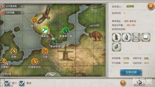 当我们购买完交易所中的商品后即可出港选择目的地,出港后可以从地图上选择目的地,我们可以从右侧的目标港口的需求上查看到目标港口的需求商品,比如是需求食品、奢饰品之类的,当自己的商品符合目标港口需求商品的时候,我们获得的贸易利润也会随着扩大。