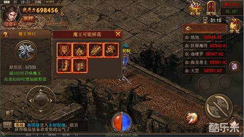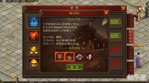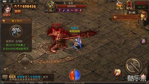 魔王来袭,烽烟再起。击杀BOSS,召唤魔王,勇夺魔王宝藏。拯救玛法大陆的勇士从四面八方汇集到魔界大陆,等待这场即将到来的战斗。跨服匹配,与全服玩家进行资源的争夺。在场景中击杀普通boss增加献祭值,集满献祭值就可召唤魔王,击杀魔王获得大量公会贡献和丰厚奖励。魔王祭坛内死亡不掉装备。激情竞技,结盟还是对抗?由你来定!