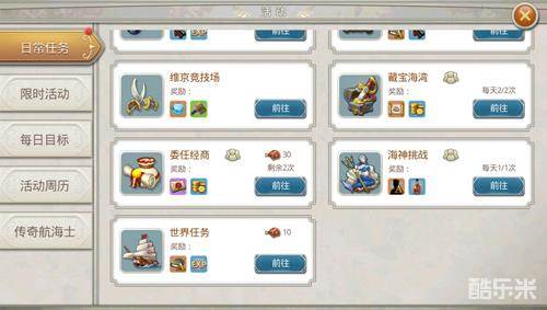 全民大航海游戏拥有非常高的游戏自由度,除了主线任务之外玩家可以自由进行海上贸易,日常任务玩家可以任意选择进行挑战。在游戏中海神挑战是一个比较难的日常任务,玩家需要在游戏中挑战一系列的传奇船只,挑战成功后即可获得奖励,挑战会随着活动进度越来越难,另外这是一个需要玩家组队完成的活动,所以找到靠谱的队友也非常关键哦!