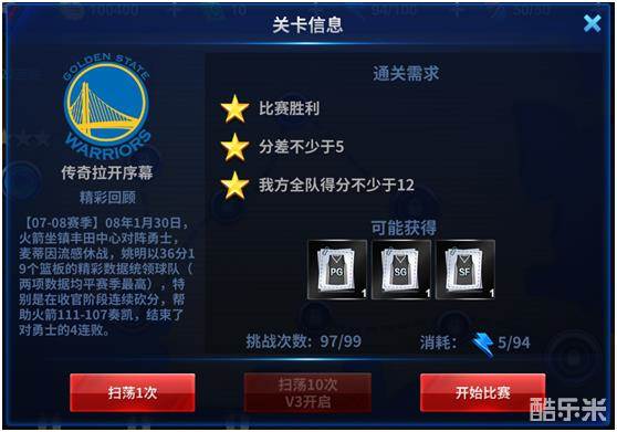 当然,经典赛扫荡是快速升级的重要手段,扫荡功能的逻辑是当经典赛某个关卡三星通关后,就开启了扫荡功能,如下图所示。扫荡一次就代表快速获得一次比赛奖励,而扫荡十次则是V特权玩家的专属,可以快速获得经理经验。所以建议有条件的玩家还是充钱开启扫荡十次会方便很多。