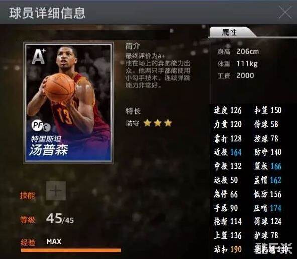 总体来说汤普森的身体素质还算不错,206的身高虽然略矮,但有126的移动速度也是一方面的补充。120的力量对于内线棒子来说有所欠缺