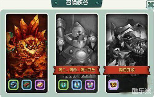从主界面的试炼入口进入召唤峡谷玩法,可以看到从左到右分3个玩法,第一个玩法产出金币,每天开放。第二个玩法产出经验药水,每周2、4、6开放,第三个玩法产出晋升材料,每周日开放。