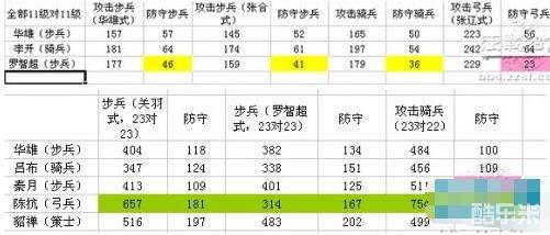 第一幅标了红色的是罗智超对弓兵的防守,那是超强的;第二幅图是秦月对骑兵的防守,也是无敌的。这两个将在系统说明中有明确规定,一个克弓兵,一个克骑兵!!!还有后面的典韦,是克策士的。后面还一个周瑜,专门攻击步兵。