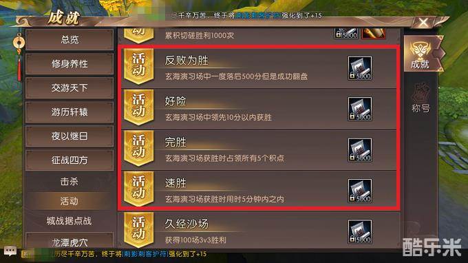需要注意的是玄海有以下四个成就:反败为胜——【玄海演习场】中一度落后500分但是成功翻盘;好险——【玄海演习场】中领先10分以内获胜;完胜——【玄海演习场】获胜时占领5个积点;速胜——【玄海演习场】获胜时用时5分钟之内。(图4)