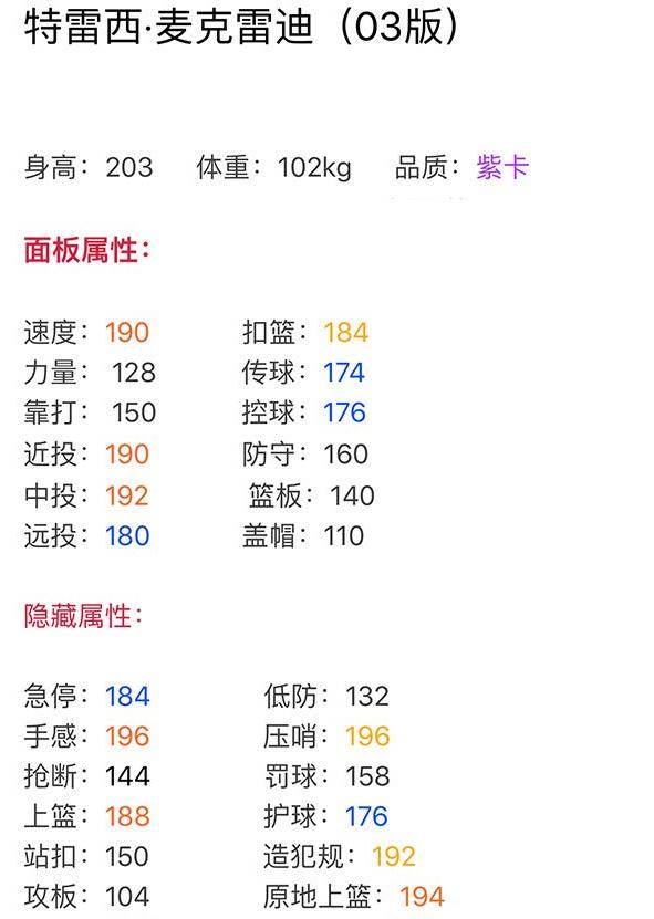 游戏中的03麦迪可以说是在游戏中最顶尖的外线,各项数据几乎都爆表,可以说是目前为止出的巅峰麦迪了,优秀的穿控,变态的投射和扣篮能力,要是非得找出一点瑕疵的话,那么就得说老话题了,麦迪的三包了。不过总体来说,麦迪还是非常好的一个球星。