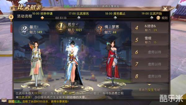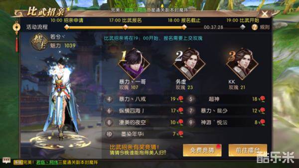 比武招亲每天的10:00女方准时报名报名所需物品:玫瑰;报名者中魅力第一的玩家可开启擂台,等待自己的有缘者迎娶自己;每天的19:00擂台开始,18:00男方开始报名打擂(报名所需物品:玫瑰),选取玫瑰数量前十名为打擂者。
