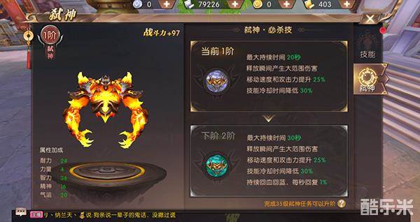 天命者还可以通过提高自身等级,接取弑神任务来提高弑神的等阶,提升弑神的基础属性,并且还能提高弑神·必杀技的威力。但是弑神等阶最多可以提升到4阶,每阶的战斗力都会越来越强(弑神·必杀技等阶可以参照下图)。