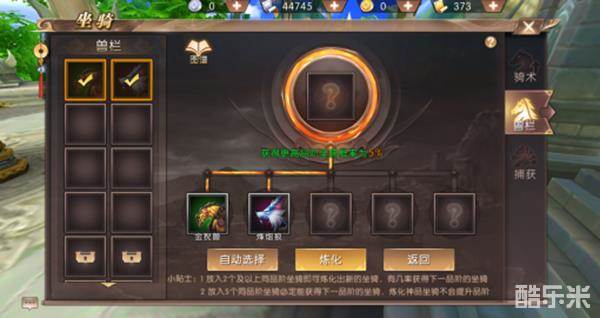 3、可以在坐骑界面通过坐骑炼化获得更高级的坐骑。简单来说就是坐骑合成。1星和2星的坐骑可以4个就炼化,一般都会成功得到更高级的。3星以上最好凑满5个在炼化,不然炼化失败会很亏的。