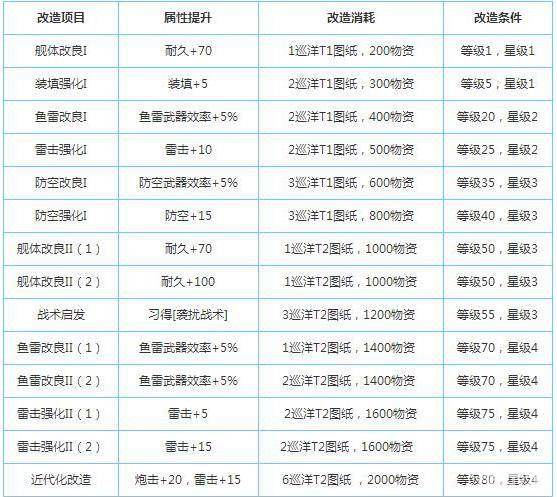 耐久+240;雷击+45;炮击+20;装填+5;防空效率+5;防空+15,鱼雷效率+15