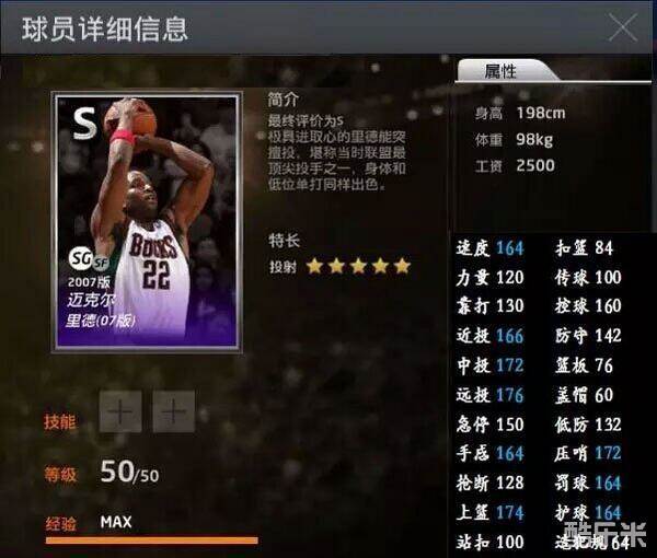 1、位置推荐:游戏中为SG/SF,个人推荐放在SG的位置上,放在SF防守有些捉急而且速度较慢;优质的纯射手,易掌握的投篮包,他的任务就是得分。