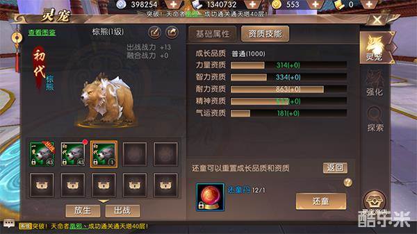 灵宠初生,都是初代宠物,品质都为普通。这个时候,天命者们可以消耗还童丹,对灵宠资质进行重置。(品质分为普通,良好,优秀,稀有,完美,卓越,至尊)