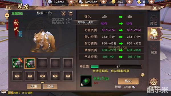 灵宠初始等阶均为0阶,需要消耗命玉进行强化,在灵宠进行强化的时候,会失败,每次失败都会提升幸运值,幸运值越高,强化成功率越高。灵宠强化等级到7和10时,灵宠的品质会自动提升一档。