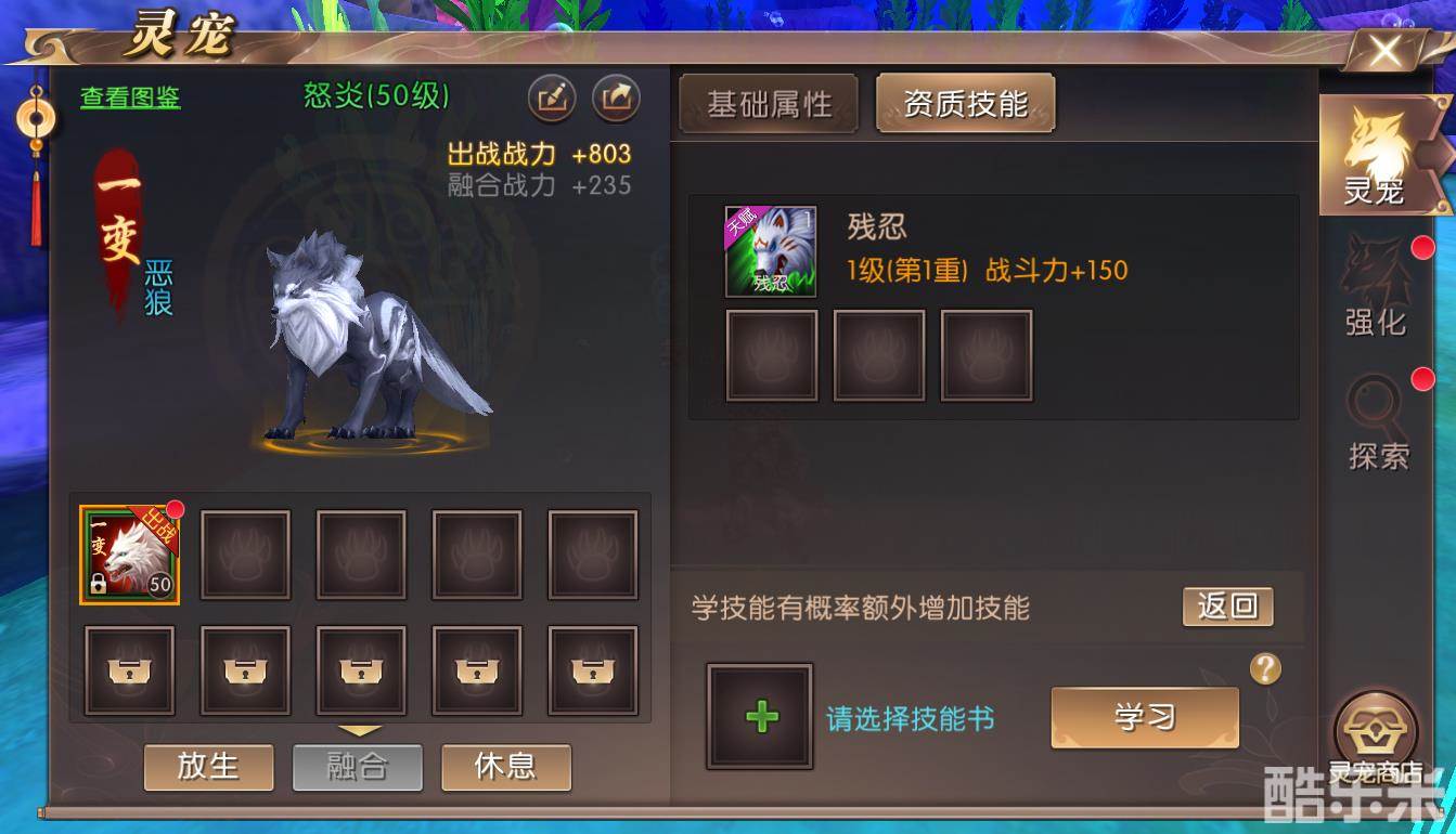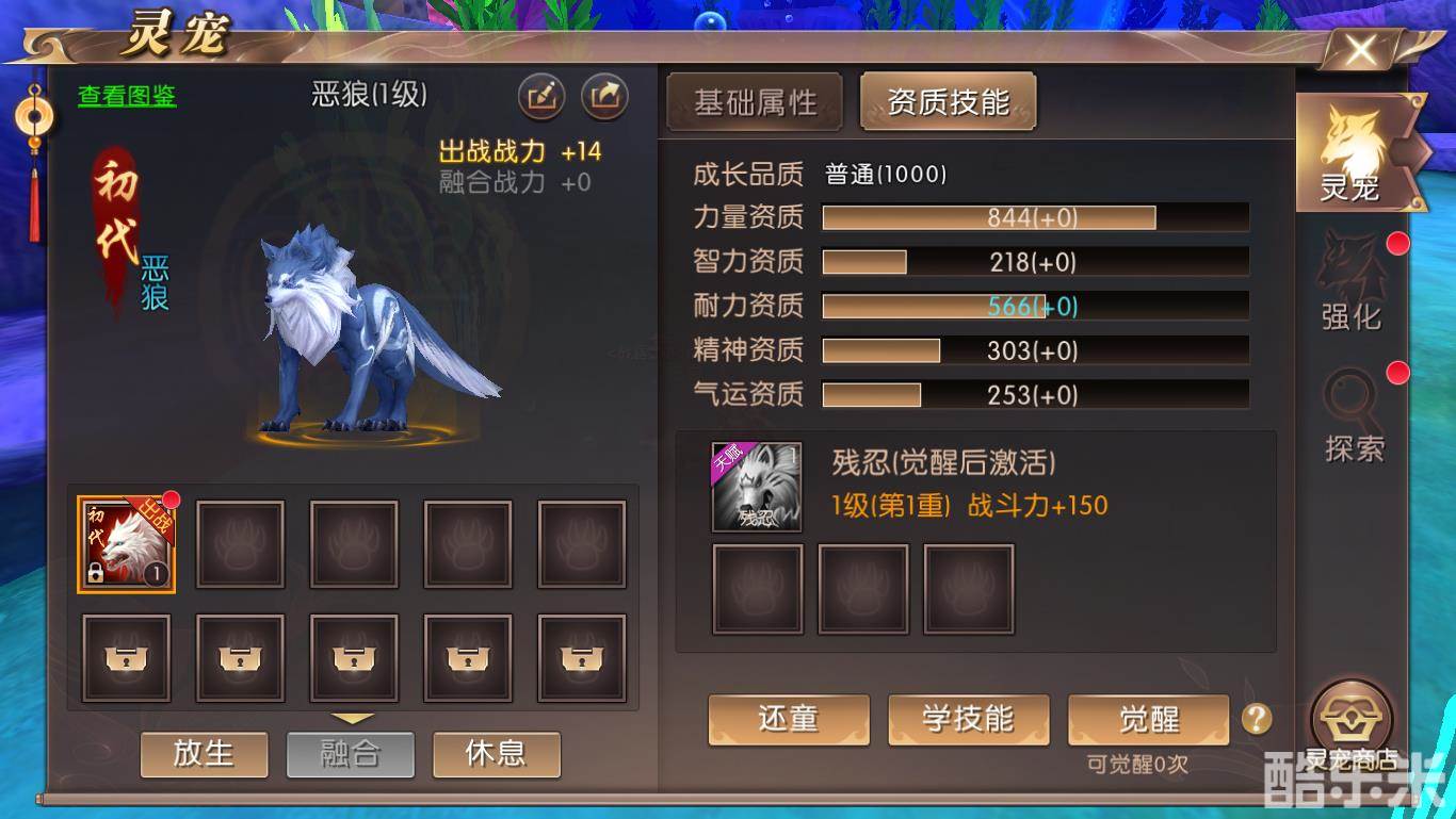 灵宠出生时便自带天赋技能(如上图的残忍),但是需要灵宠觉醒后才能激活生效,每个灵宠对应的天赋技能都不一样。通过购买领悟或高级领悟,可以升级天赋技能的等级,等级越高,战力和效果越强。