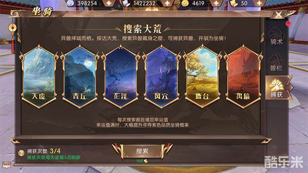 这时,我们会看到一个搜索大荒,每一个荒地里面的异兽,都是不同的,大家可以自己点击查看异兽类型以及外观。当然,只有成功抓捕到后,才会成为天命者的坐骑。