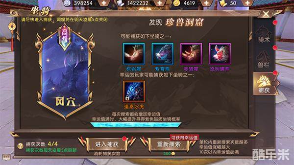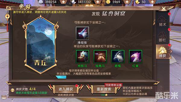 每次重新搜索,都会提升天命者的幸运值,10次搜索,幸运值必定满,当幸运值满后,天命者会有极大的概率捕捉到紫色坐骑,还有一定概率,会捉到橙色的坐骑,橙色坐骑为尊品坐骑,在游戏前期就是相当牛叉的存在了。