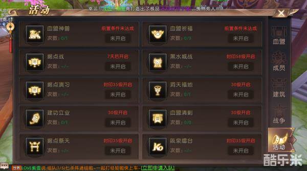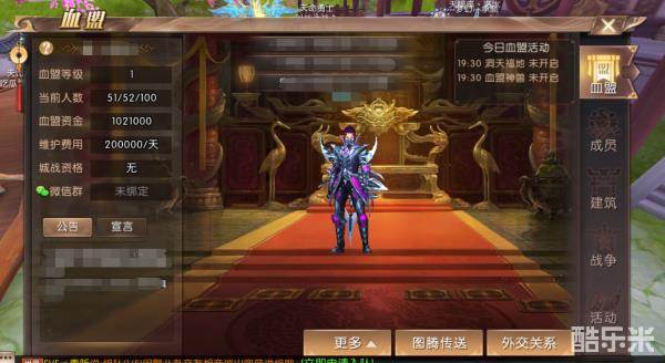 说了官职各位一定已经有想尝试的了,接下来让我们说下盟会活动。盟会的活动有血盟祈福每天可以完成3次获取盟会盟贡和血盟金。血盟清剿可以每天完成5次,可以获得经验值以及血盟的贡献度,还有洞天福地每天19点30到20点30级以上的血盟成员可以在血盟驻地图腾附近喝酒获取大量经验呢,但是不要贪杯哦~除了这些还有血盟神兽,每天19点半到20点盟主或者统战可以在领地中召唤血盟神兽,所有血盟成员都可以参加击杀后所有参与的血盟成员可以获得装备强化材料,盟贡,宠物材料等奖励呢但是小伙伴注意了一定要在30分钟内击杀否则神兽消失了可就没有奖励咯。