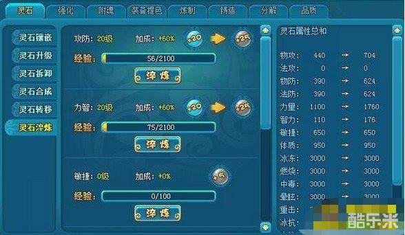 淬炼分为40级,每级淬炼可提升身上所有对应灵石的百分比效果属性,最高淬炼等级(40级)可提升120%灵石属性。
